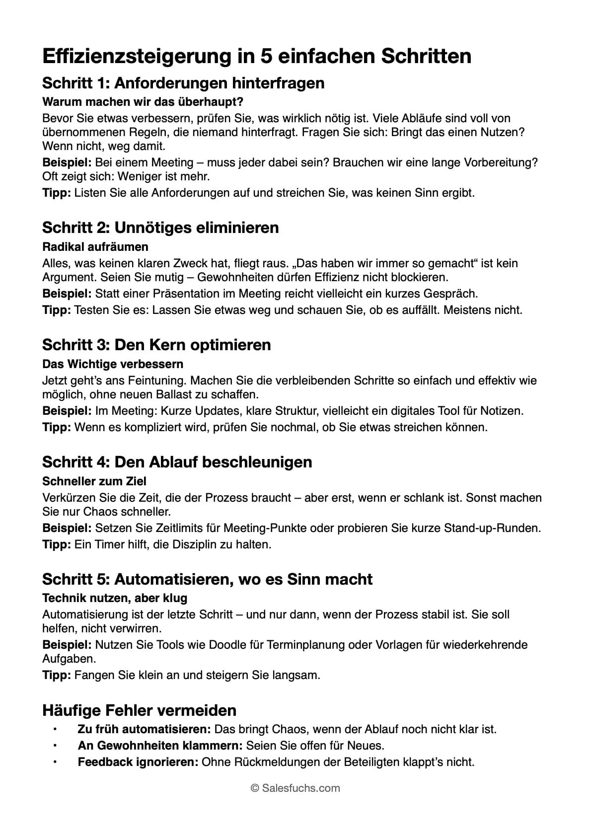 Sein pragmatischer Ansatz zeigt, dass Effizienz für jeden erreichbar ist – mit ein bisschen gesundem Menschenverstand und fünf klaren Schritten. Lassen Sie uns gemeinsam durchgehen, wie Sie Ihre Prozesse schlanker, schneller und effektiver gestalten können.